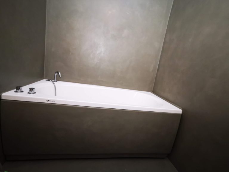 Mikrotsemendiga kaetud valamukapp, vanni esipaneel, seinad ning põrand.